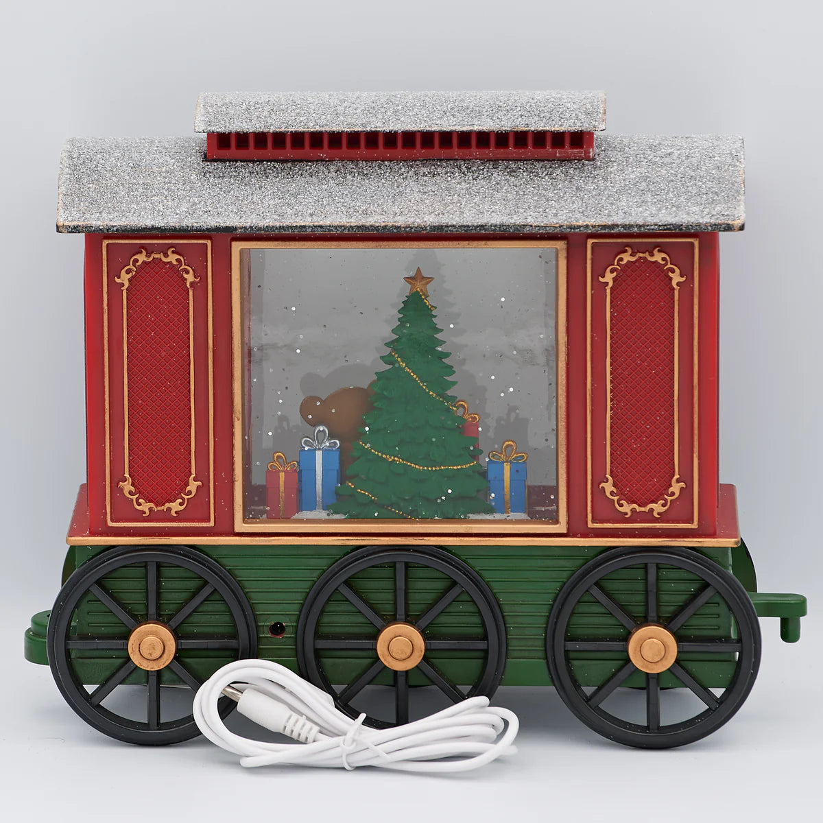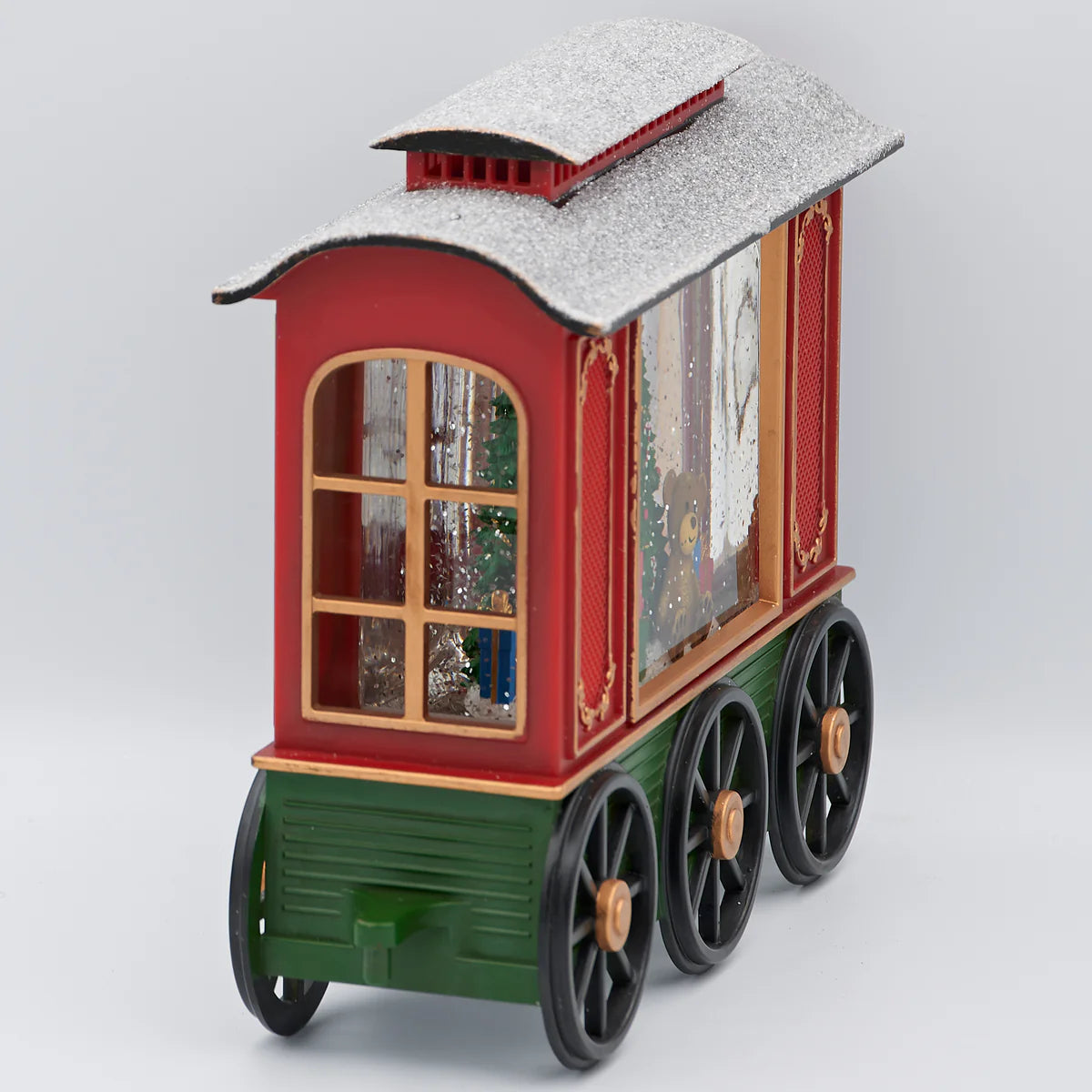 Add a touch of holiday whimsy with this festive lighted swirl train car. Inside, a cheerful bear stands beside a decorated Christmas tree as swirling glitter sparkles in the glow of warm lights. A playful accent for seasonal displays, mantels, or train-themed décor, it brings charm and holiday spirit to any collection.