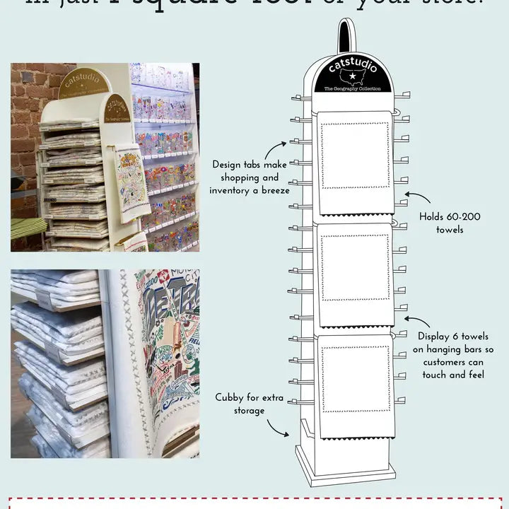 * SELLING TIPS + TRICKS: Carry all 50 states and at least 10 hot spots. Customers love to find their hometown, collect the places they've been, or give the gift of a loved one's favorite place. Stock a variety and watch your sales grow! Check out our dish towel spinner to learn how you can create a highly profitable investment in just 1 square foot of your store. Also be sure to check out our dish towel suitcase display - complimentary with your opening order!