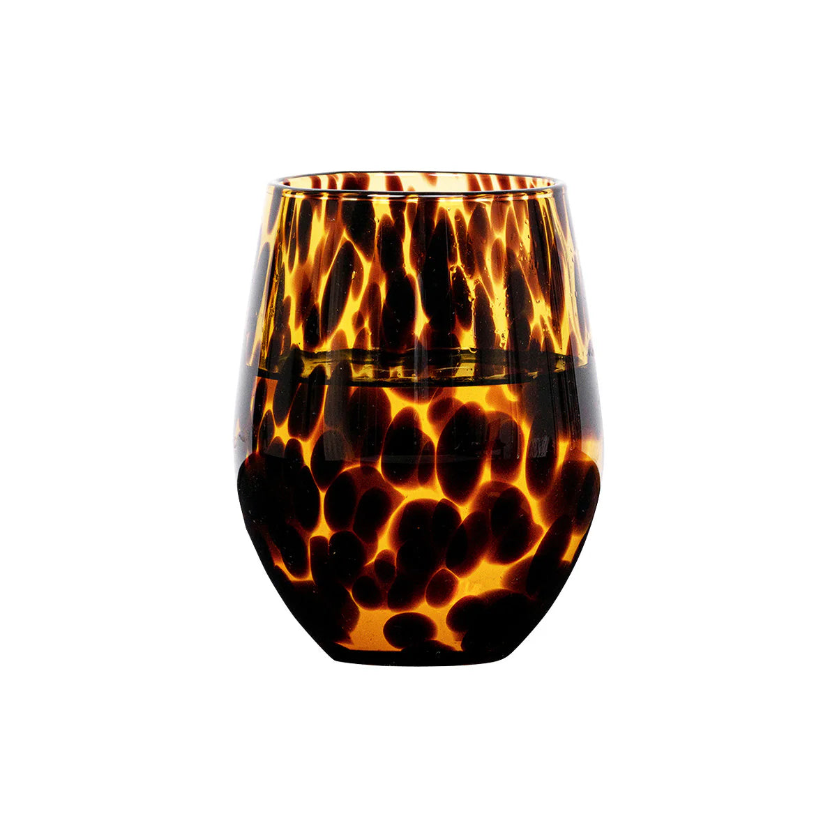 Elevate your drinking experience with our Tortoiseshell Stemless Wine Glass. The translucent brown body and dark specks create a rich aesthetic while offering the perfect vessel for your favorite drink. Embrace the luxury and style of this unique glass.