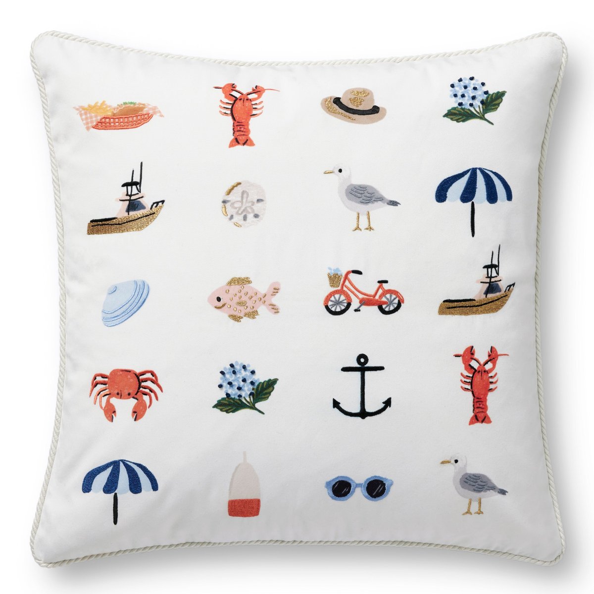 • Lobsters, hats, umbrellas, and anchors are just a few of whimsical motifs that decorate the surface of this coastal accent pillow. Many of these patterns are beautifully embroidered and embellished for texture.