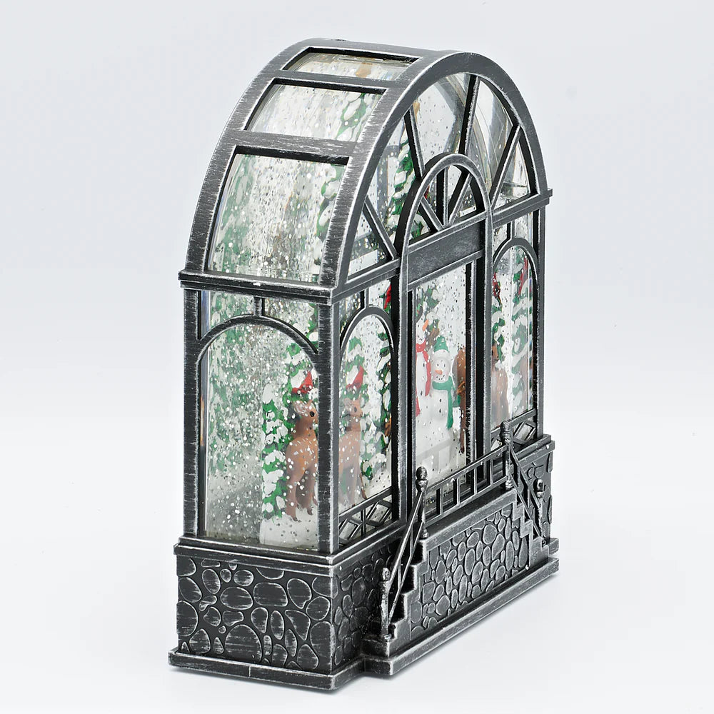 Celebrate nature and winter magic with this festive lighted swirl greenhouse. Inside, cheerful snowmen are surrounded by deer and snow-covered trees, while glitter sparkles in the glow of soft illumination. A cozy and whimsical holiday display, it’s perfect for mantels, shelves, or tabletops and makes a charming seasonal gift.