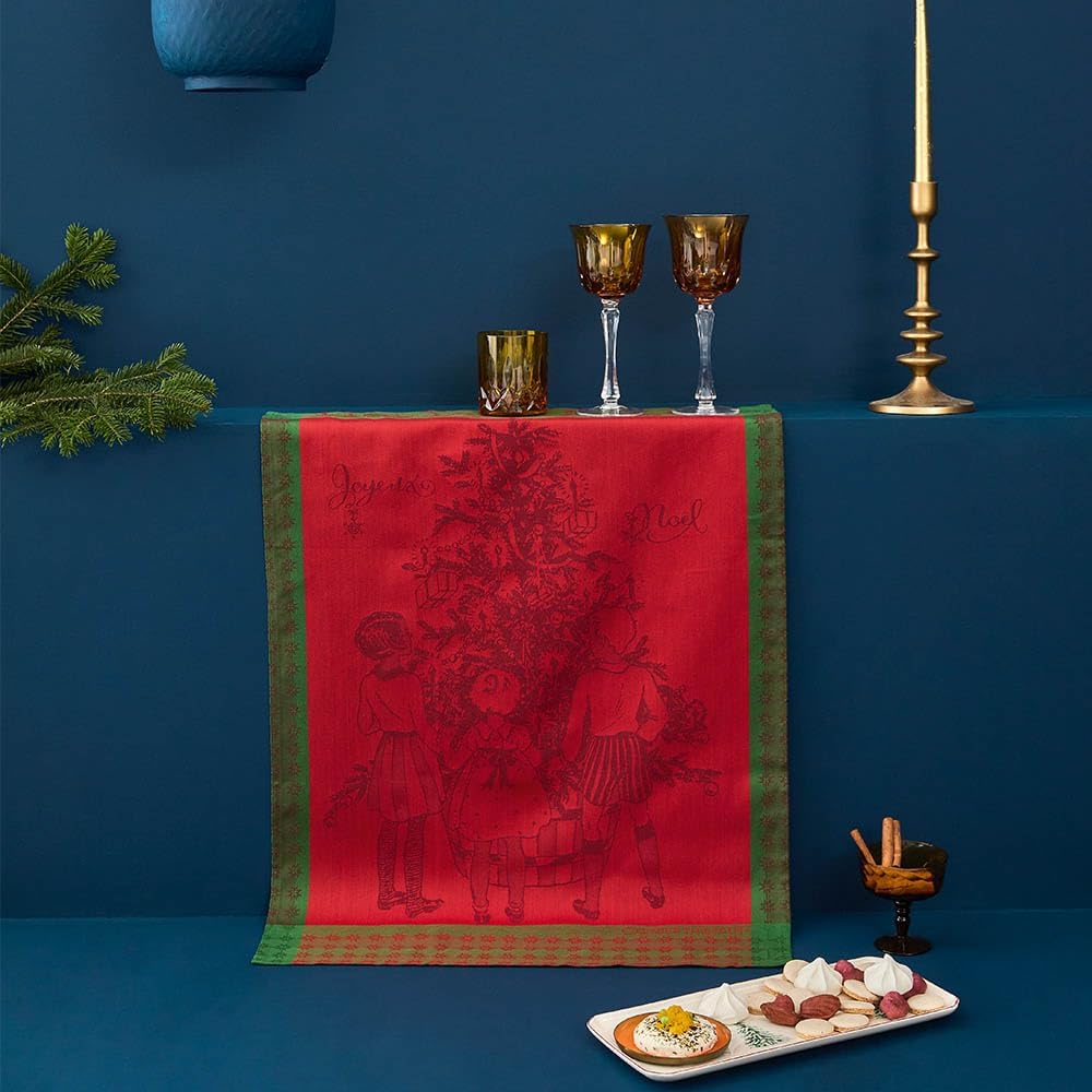 - DESIGN: Captures the spirit of the season with a festive scene of children around a Christmas tree in red and green hues. Its cotton texture brings warmth and joy to holiday kitchens.