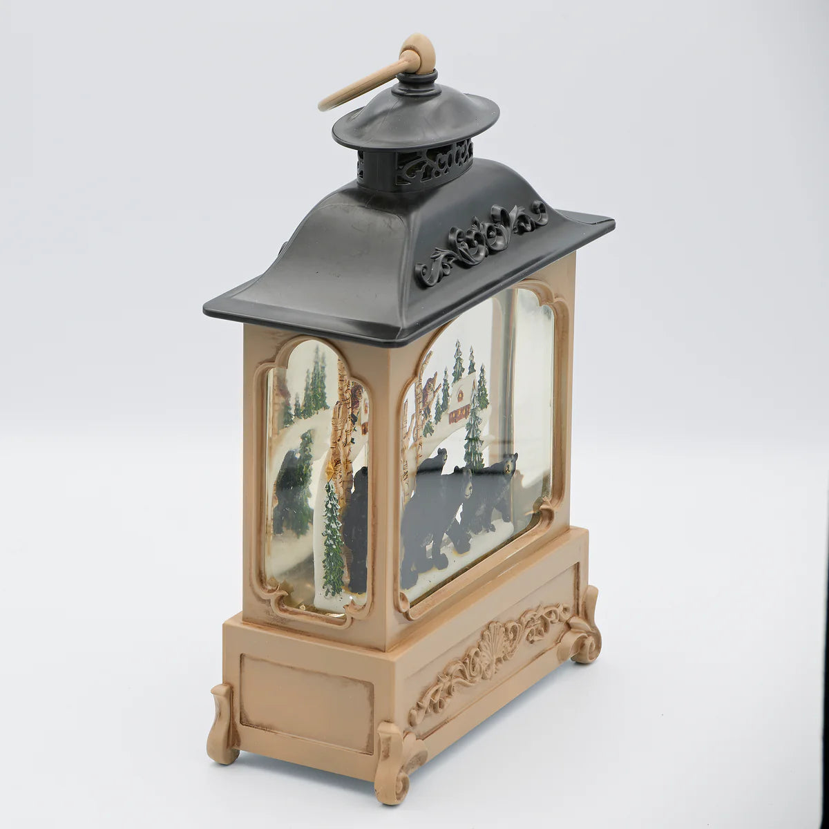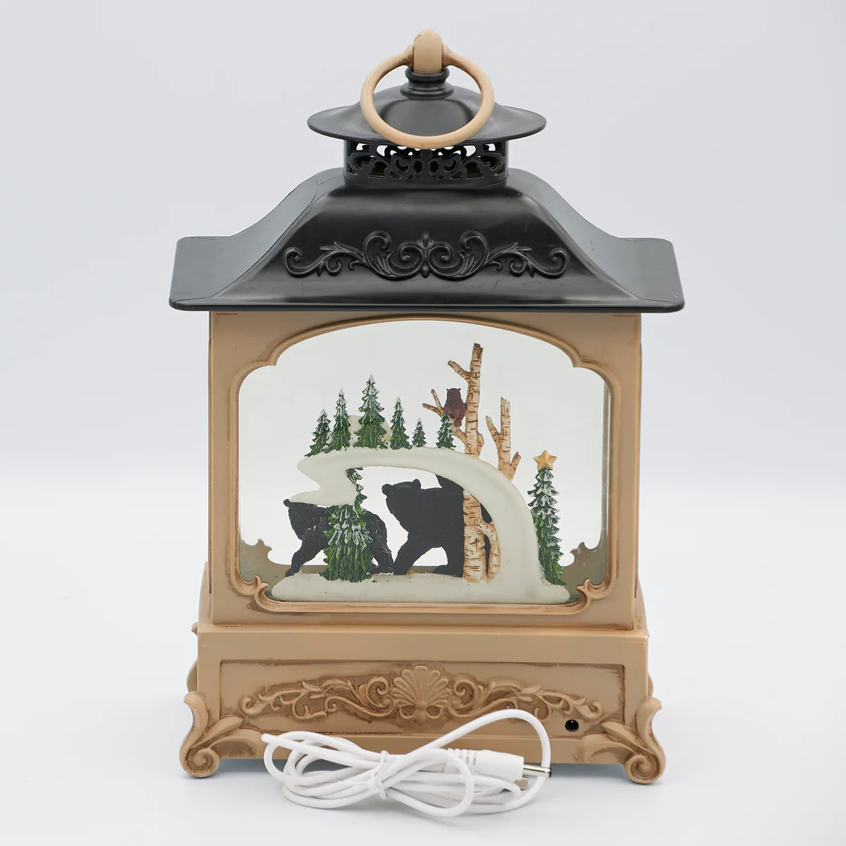 This lighted swirl lantern showcases a cozy bear family scene near a rustic cabin. Gently swirling glitter brings this peaceful woodland moment to life‚ perfect for winter decor.